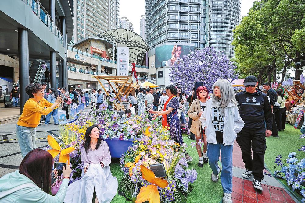 昆明順城購物中心“藍楹絮語·第二屆花花市集”引來眾多游客拍照打卡。本報記者 胡妤雅 攝