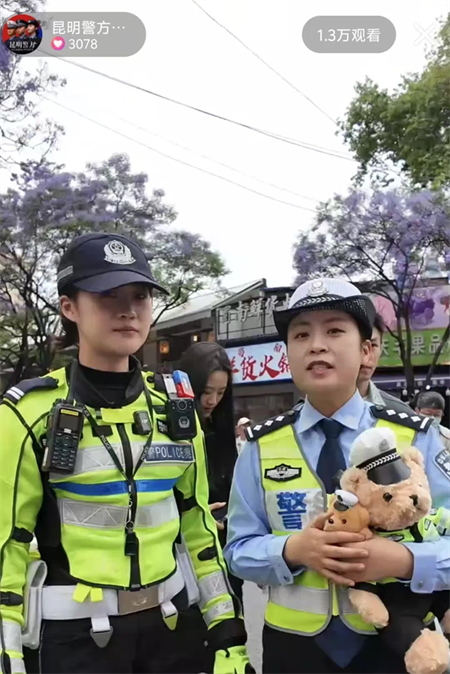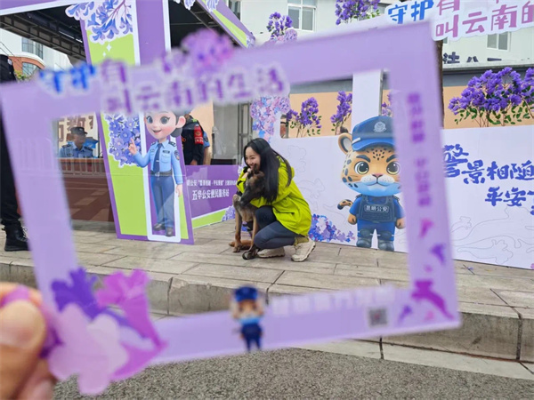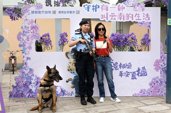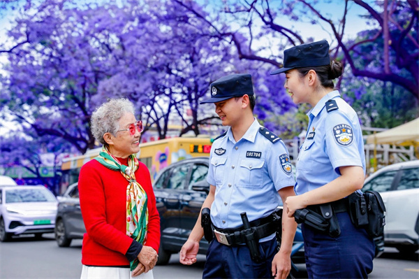 這是“守護有一種叫云南的生活”昆明公安“警景相隨·平安夏楹”主題宣傳活動中的溫馨一幕。“五一”期間,昆明公安在教場中路持續(xù)開展活動,“警察藍”用實力護航“賞楹季”。