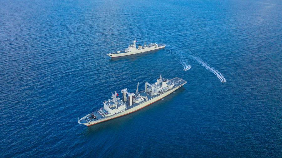 中國海軍第46批護(hù)航編隊(duì)組織反恐反海盜演練,艦艇掩護(hù)小艇出擊(2025年1月2日攝)。中國海軍第46批護(hù)航編隊(duì)完成亞丁灣、索馬里海域護(hù)航等任務(wù)后,24日返回廣東湛江某軍港。新華社發(fā)(張大禹攝)