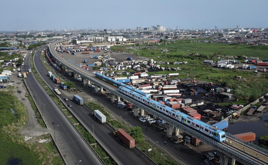 2024年3月4日,在尼日利亞拉各斯,對向行駛的兩列輕軌藍(lán)線列車會車(無人機(jī)照片)。由中國土木工程集團(tuán)有限公司承建的拉各斯輕軌藍(lán)線項(xiàng)目一期于2010年7月開工,2022年12月竣工,全長13公里,設(shè)有5個(gè)車站,設(shè)計(jì)時(shí)速80公里。新華社記者韓旭攝
