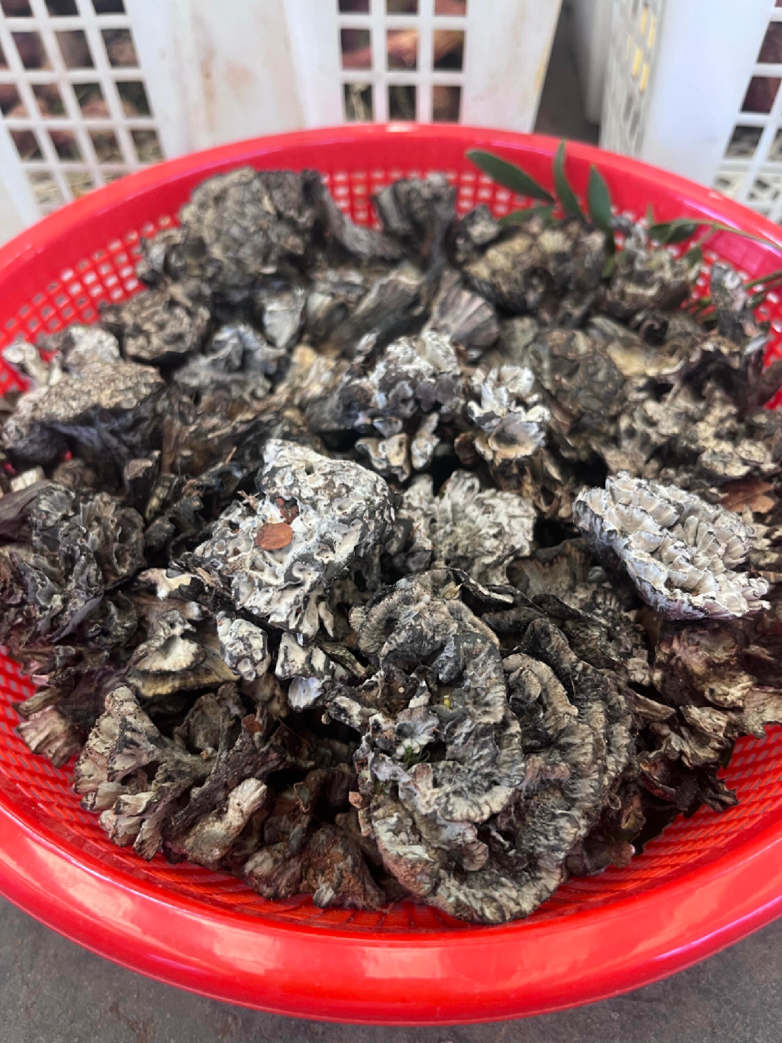 5月7日,云南木水花野生菌交易中心(以下簡稱木水花市場)頭水干巴菌上市,共700克,售價2600元一公斤。