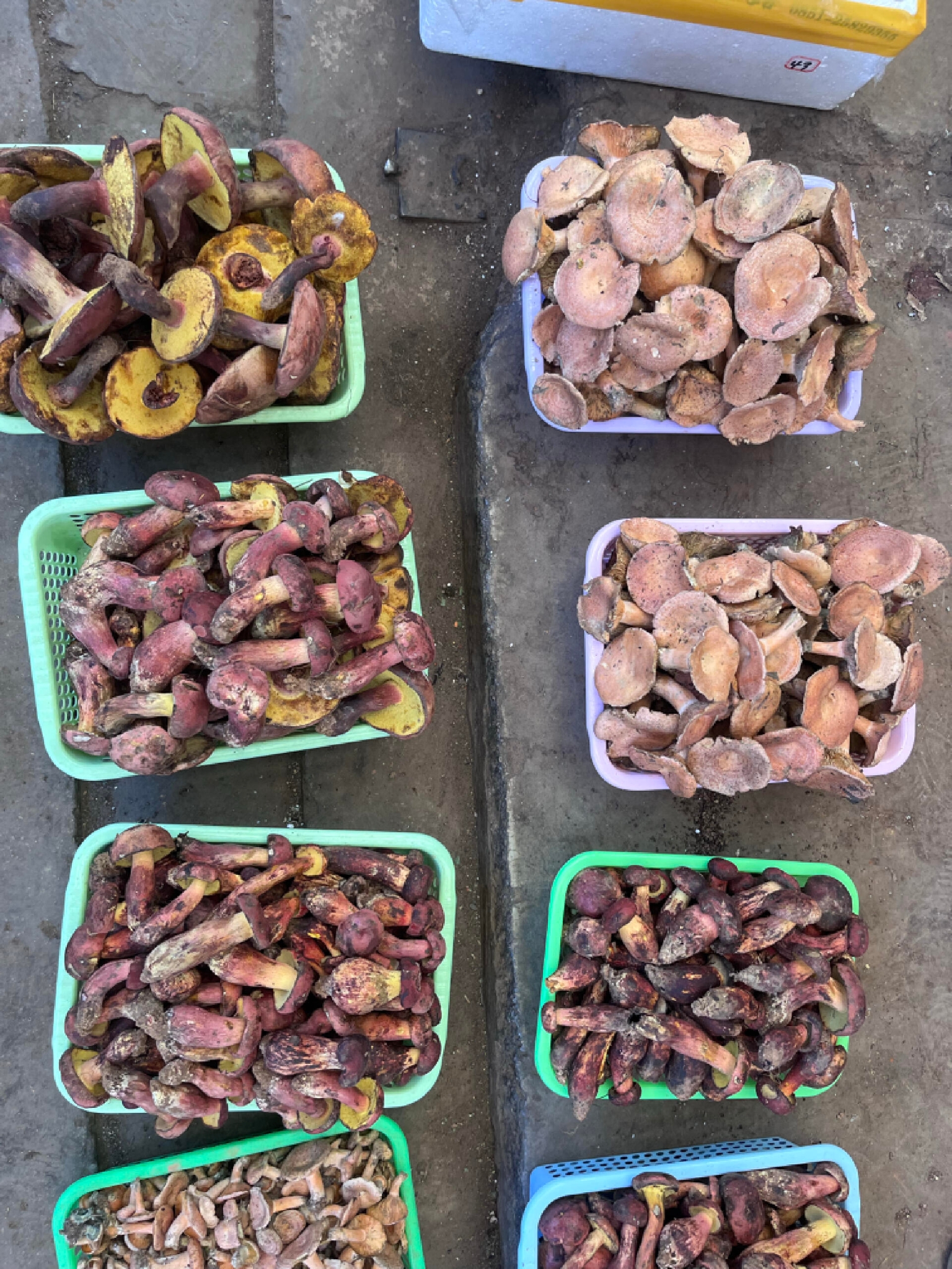 “要不要帶點(diǎn)谷熟菌,100元一公斤?!蓖跖繑偽簧?,野生菌品類較多。見手青300-600元一公斤,谷熟菌100-220元一公斤,銅綠菌80元一公斤?!白罱颇媳镜氐囊吧懤m(xù)上市,但因?yàn)閮r格高、顧客少,銷量不算好。”