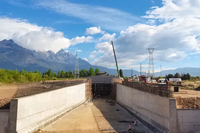 5月4日,麗江古城至寧蒗高速公路項(xiàng)目土建二分部玉峰路下穿通道主體工程全部澆筑完成。玉峰路下穿通道為地方道路玉峰路下穿古寧高速主線(xiàn)而設(shè)置,全長(zhǎng)214.51米,其中暗埋段全長(zhǎng)41.03米,敞開(kāi)段全長(zhǎng)173.48米,最大挖深約8米,設(shè)計(jì)為雙向兩車(chē)道,設(shè)計(jì)時(shí)速40公里。
