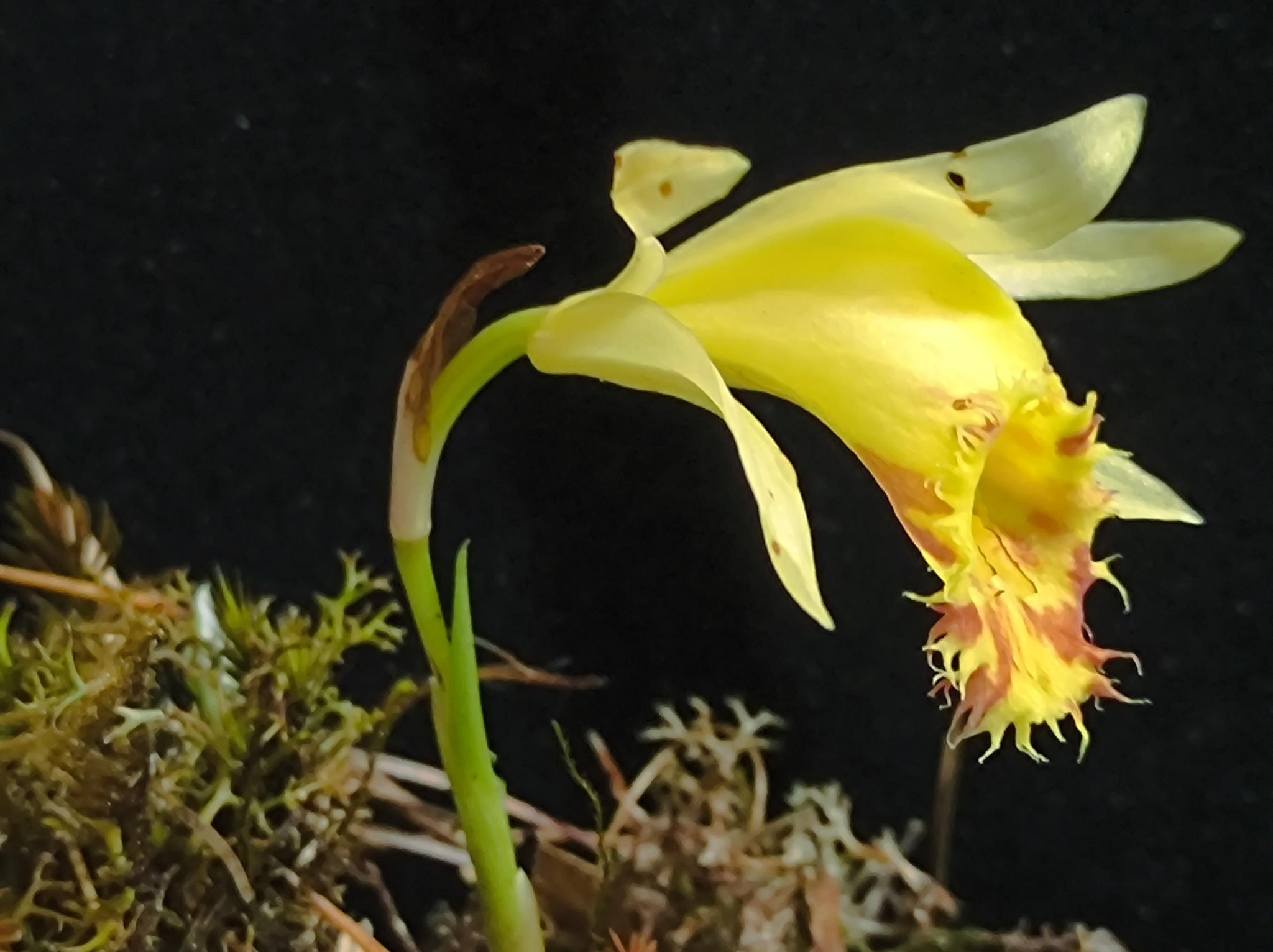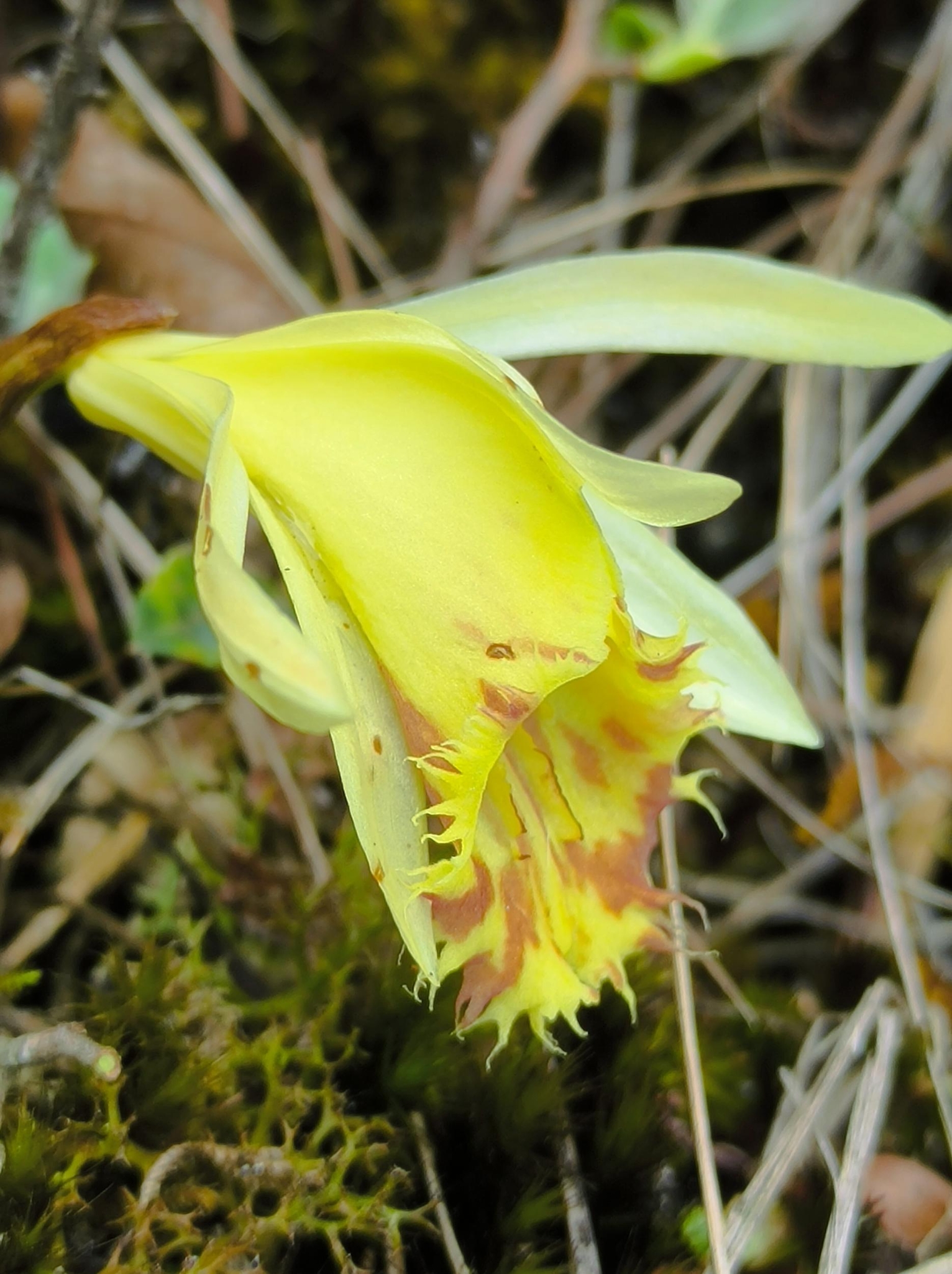 黃花獨蒜蘭為蘭科獨蒜蘭屬附生草本植物,一般生于疏林下或林緣腐殖質(zhì)豐富的巖石上,也見于巖壁和樹干上,生長海拔2200至3100米,花期為4至5月。其形態(tài)特征為:頂端1枚葉,葉在花后出現(xiàn);花苞片長圓狀披針形或披針形,花黃色、淡黃色或黃白色,花瓣鐮刀狀倒披針形;唇瓣寬倒卵狀橢圓形或近寬菱形,唇盤上具5至7條褶片。
