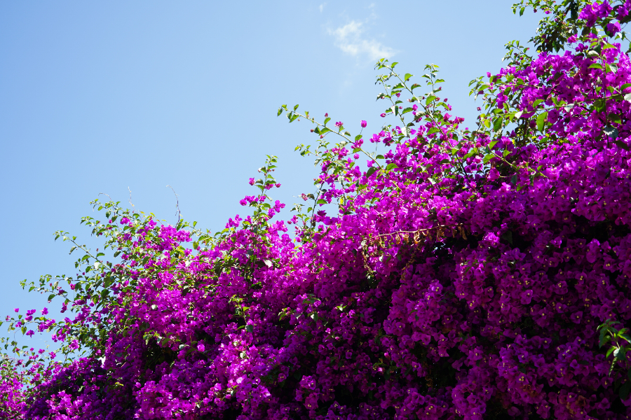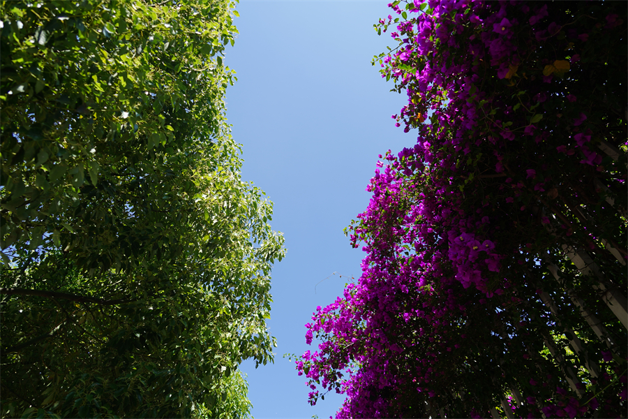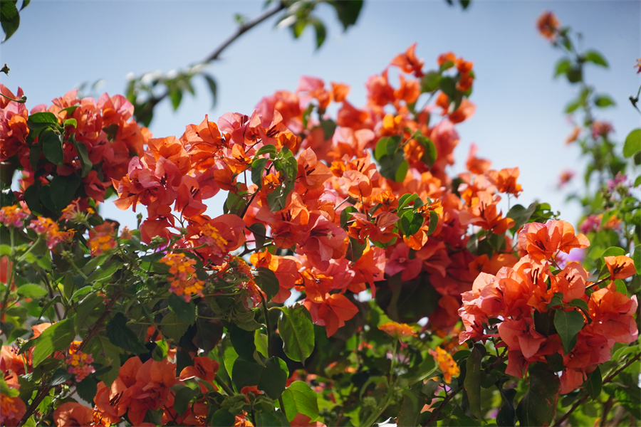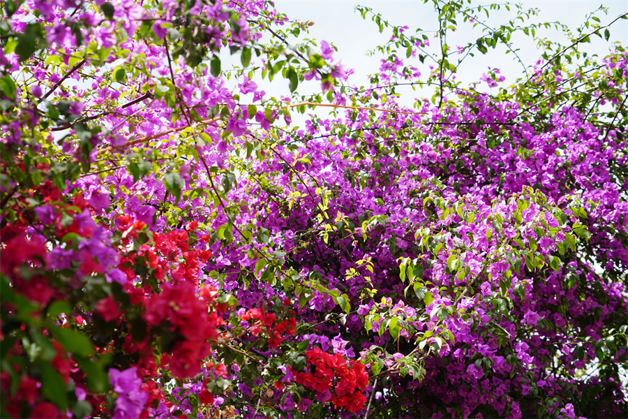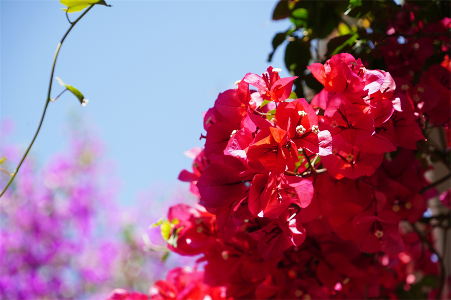 昆明市的三角梅品種繁多,正紅色的“同安紅”,耐熱性強,花期比較長,陽光透過正紅的花瓣在綠葉間投下水紅色的倒影,光越強花愈盛,團團簇簇,如烈火燃燒?!鞍哺袼埂蹦秃暂^其他品種較為突出,即使在冬天也持續(xù)開花。