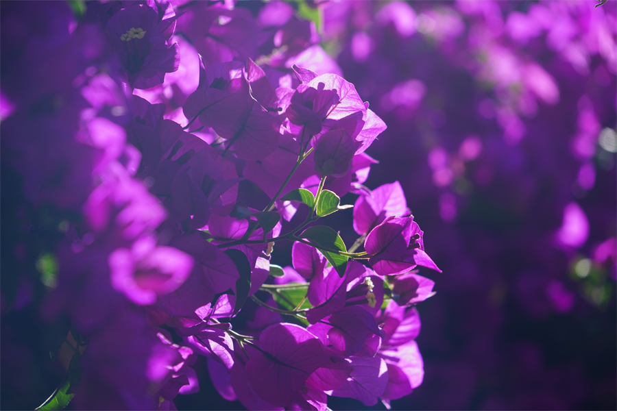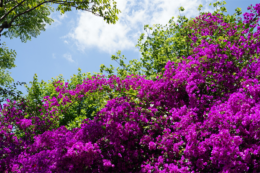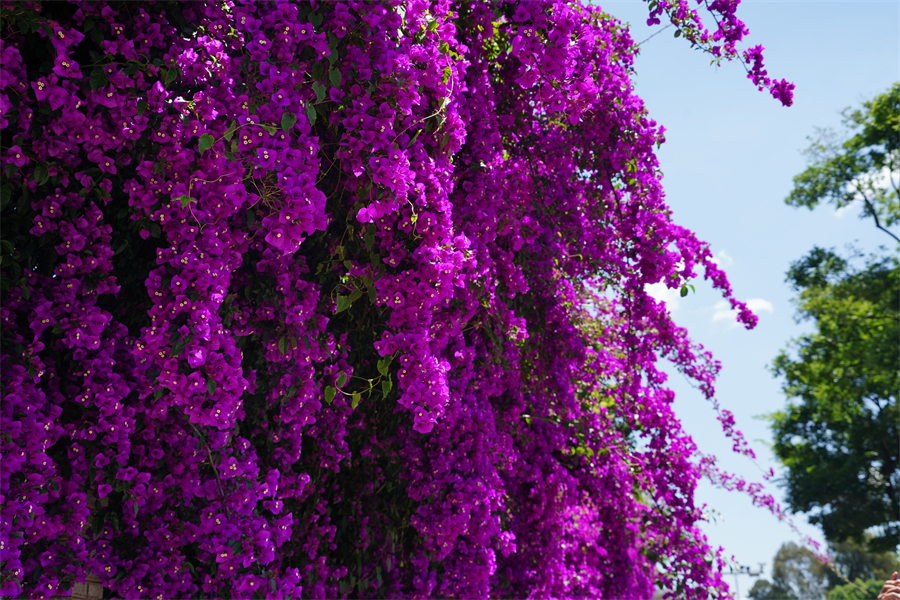 五月,昆明市的街頭隨處可見艷麗的三角梅。它們小巧精致,簇?fù)碓谝黄?,形成一片花的海洋?/p>