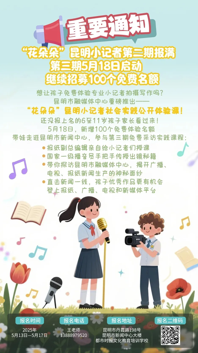 兩期公開(kāi)體驗(yàn)課、215份隨堂作業(yè),最終40多名“花朵朵”昆明小記者的作品分兩期登上報(bào)紙、廣播、電臺(tái)和新媒體平臺(tái),成為傳播昆明歷史文化最靈動(dòng)的符號(hào)、最美好的圖案、最優(yōu)美的文字。5月18日,“花朵朵”昆明小記者第三期社會(huì)實(shí)踐公開(kāi)體驗(yàn)課將如約而至,目前,再次新增的100個(gè)免費(fèi)體驗(yàn)名額即將報(bào)滿,還沒(méi)有報(bào)上名的6—11歲孩子家長(zhǎng)看過(guò)來(lái),掃碼或撥打電話報(bào)名。