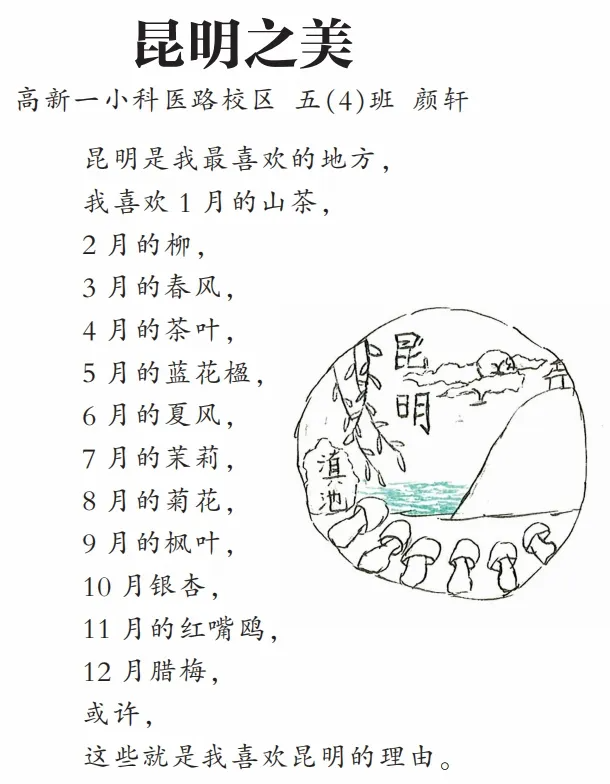 高新一小科醫(yī)路校區(qū)五(4)班的顏軒用不同的動(dòng)植物和風(fēng),表達(dá)昆明四季之美:“昆明是我最喜歡的地方,我喜歡1月的山茶,2月的柳,3月的春風(fēng),4月的茶葉,5月的藍(lán)花楹,6月的夏風(fēng),7月的茉莉,8月的菊花,9月的楓葉,10月銀杏,11月的紅嘴鷗,12月臘梅,或許,這些就是我喜歡昆明的理由?!倍鞣N隨手產(chǎn)生的精彩畫(huà)作,則表現(xiàn)了昆明的另一種意象:昆明,既是花的世界,也是鳥(niǎo)的居所,還是美食的聚集地。