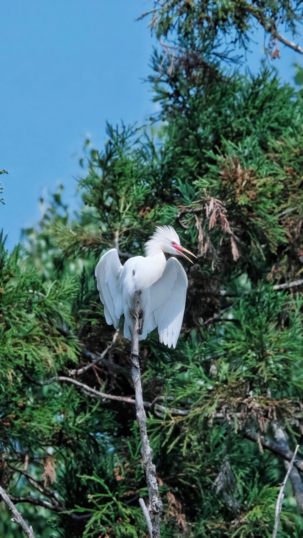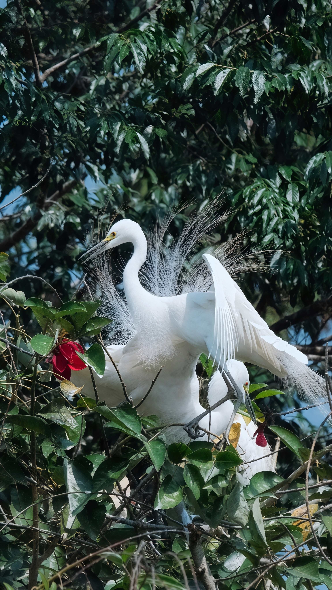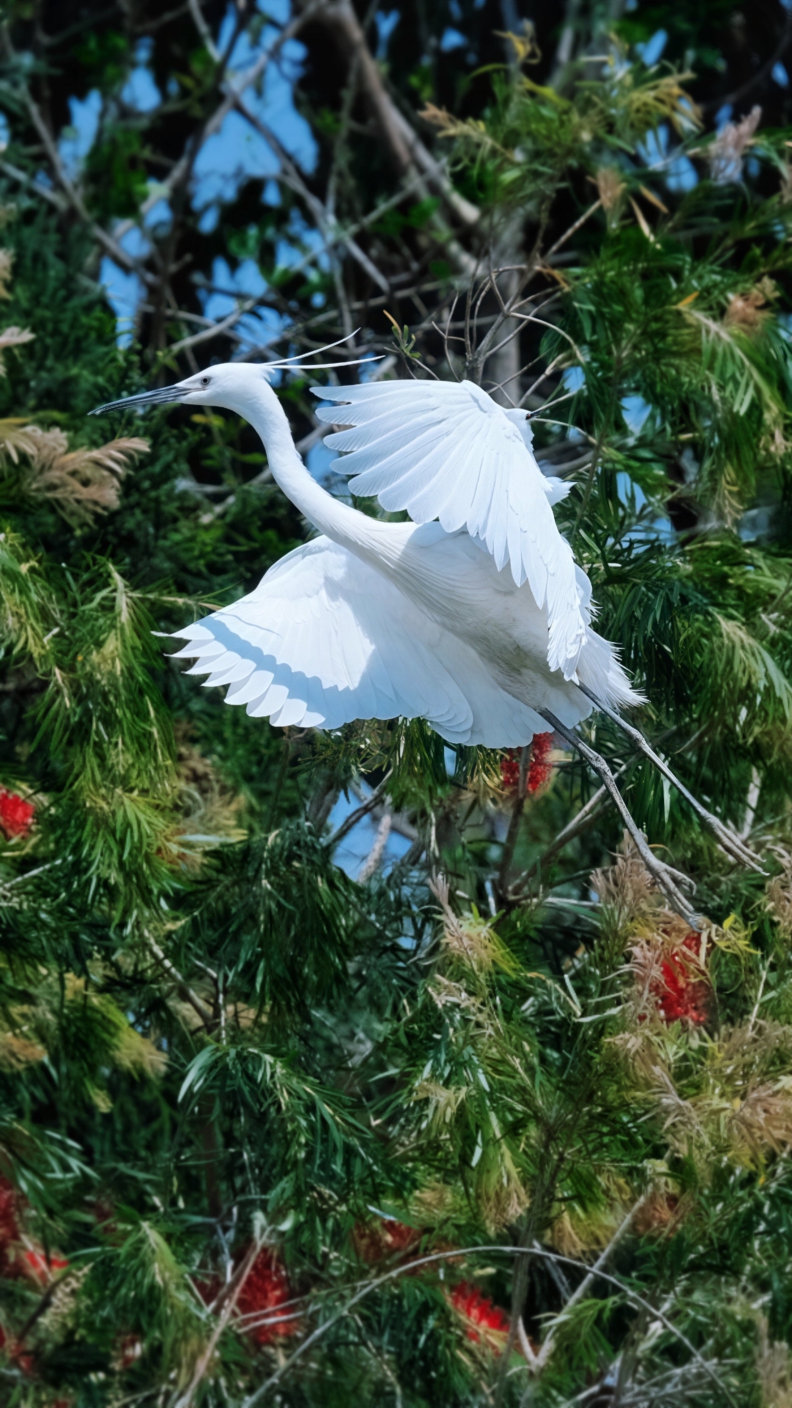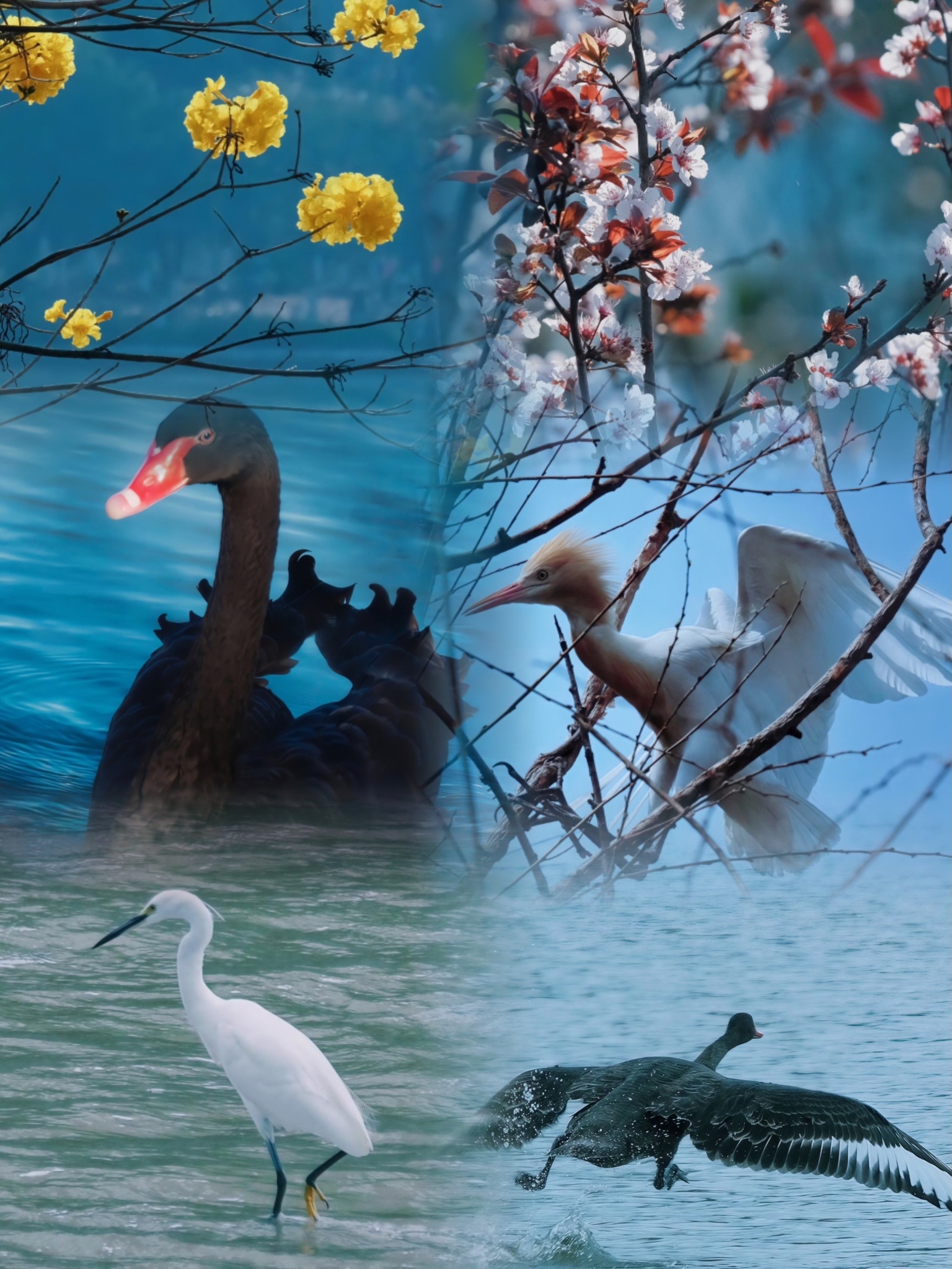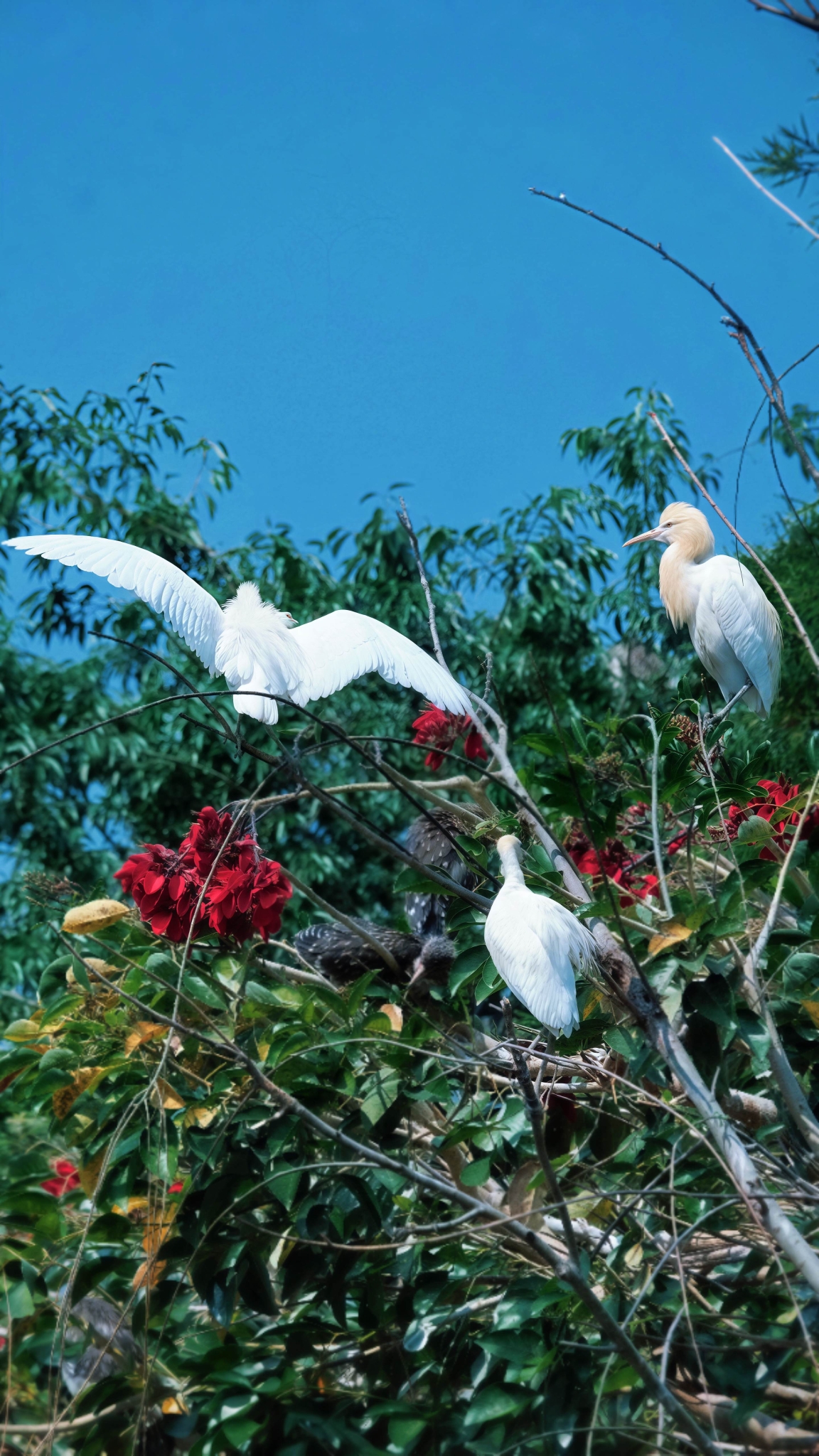 玉龍湖的湖心小島上聚集著數(shù)十只白鷺,它們或悠閑地曬著太陽(yáng),或在湖邊專注覓食,雪白的羽毛與繁花綠影相襯,顯得清逸出塵。一陣風(fēng)過(guò),白鷺群忽而展翅高飛,在空中盤旋翱翔,為靜謐的湖面增添了幾分靈動(dòng)。