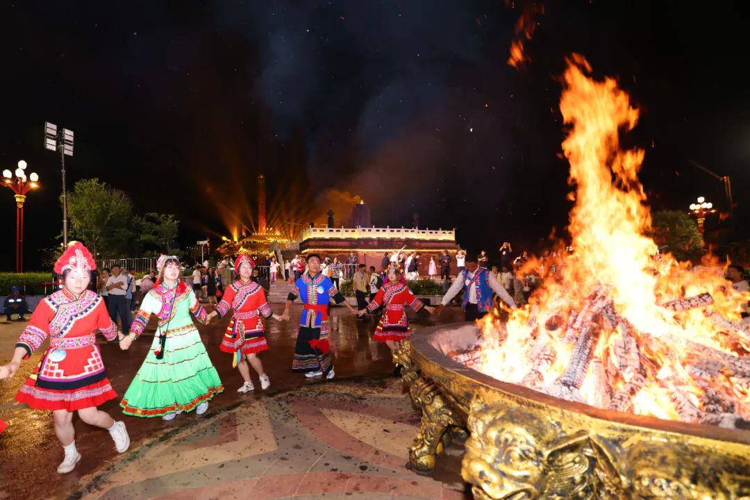 當(dāng)?shù)厝嗣褫d歌載舞慶祝楚雄彝族火把節(jié)。楚雄州委宣傳部供圖