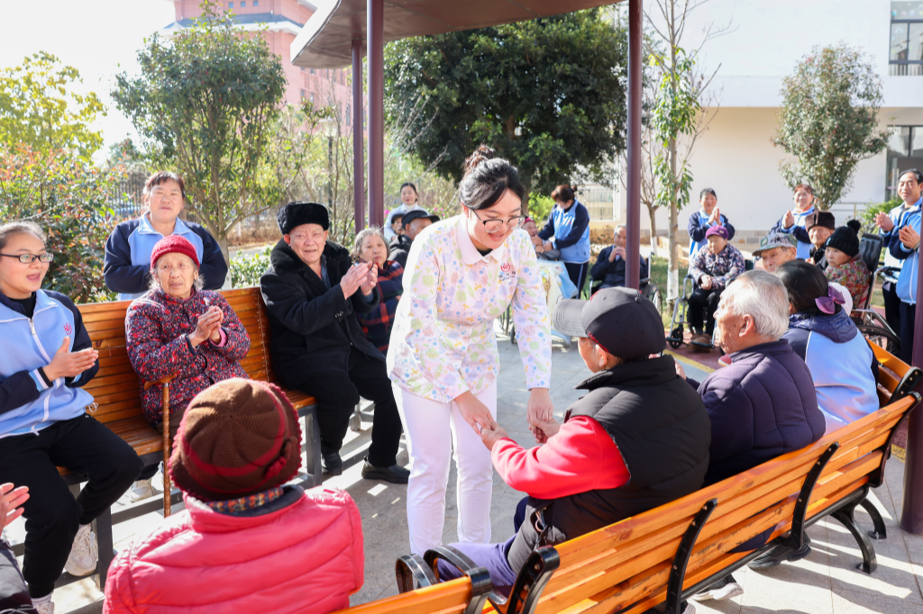 圖為大姚縣醫(yī)養(yǎng)照護(hù)中心內(nèi),醫(yī)護(hù)人員與老人互動(dòng)。楚雄州委宣傳部供圖