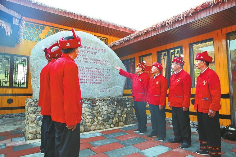 村頭的廣場上,矗立的一塊巨石紀念碑,用漢語、佤語兩種文字鐫刻著習近平總書記給滄源縣邊境村老支書們的回信。習近平總書記重要回信精神宣講站里張貼了當初寫信的10名老支書的照片。一個木屋,幾把藤椅,游客們、青少年慕名前來,聽老支書們宣講回信精神,講述佤山的新變化。