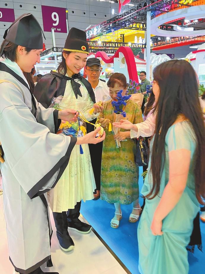 巨型鮮花孔雀前,游客競(jìng)相打卡留念,定格下一張張燦爛的笑臉。本屆深圳文博會(huì),新增“霞客行之江山多嬌”“鄭和行之友誼使者”兩大主題,亦能看到兩位扮演者身著古裝穿越到現(xiàn)場(chǎng),贈(zèng)送香囊與游客互動(dòng)。