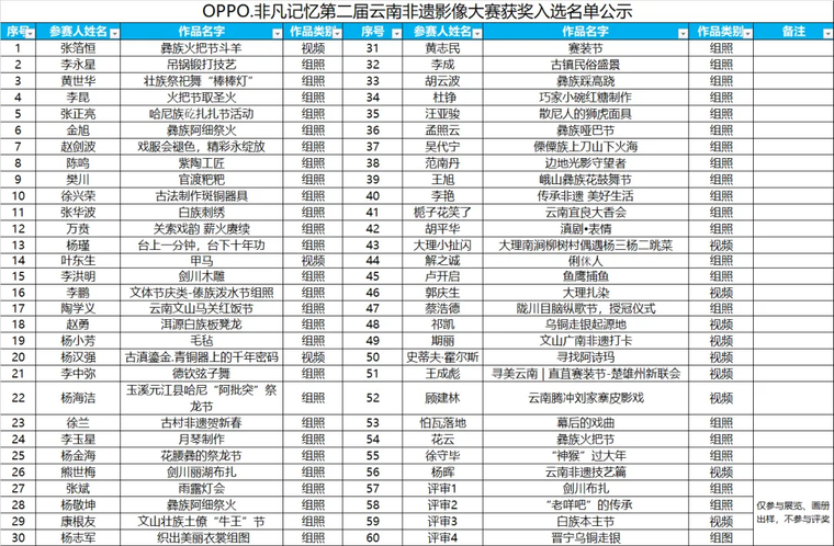 經(jīng)過評審委員會3輪的評審與研究,現(xiàn)公示評審結(jié)果:總共入圍60組/人作品,其中照片48組/人,視頻12組/人。入選作品將于6月13日-27日在昆明市博物館進行展出,同時我們將邀請入圍作者參與現(xiàn)場頒獎典禮(6月13日10:00),務必本人到現(xiàn)場領取獲獎證書、收藏證書及獎金。