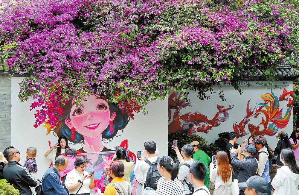 端午假期,昆明中和巷的三角梅“簪花少女”和錦鯉花墻吸引了市民和游客前來打卡。 本報記者 楊崢 攝