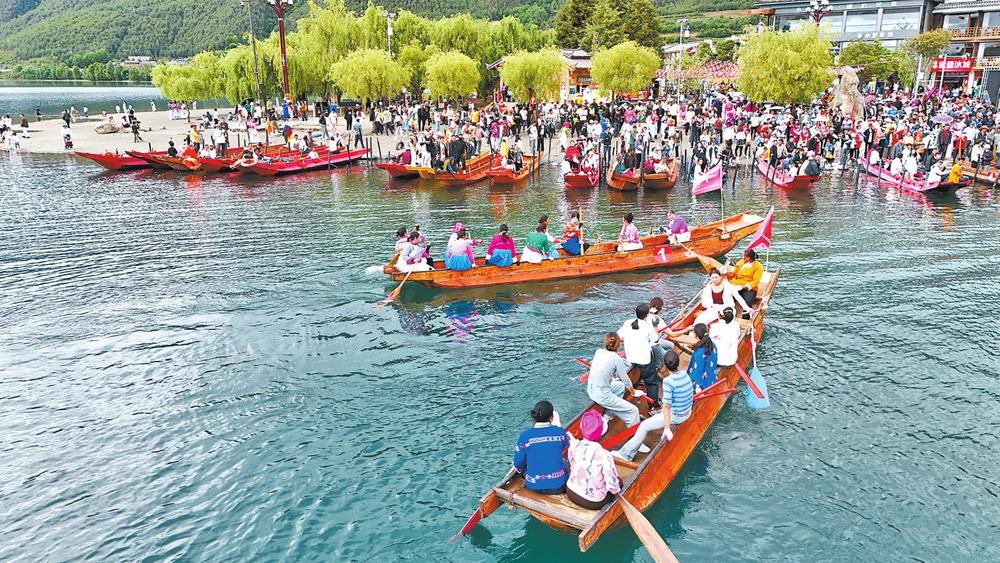 端午假期,麗江瀘沽湖景區(qū)大落水村的游船停靠點熱鬧非凡,川滇各村組群眾身著盛裝齊聚,共同開展摩梭傳統(tǒng)豬槽船大賽系列活動。