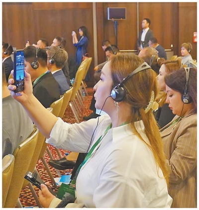 參加2025中國—中亞媒體合作論壇報道的中亞國家媒體記者正在拍攝視頻。 |
