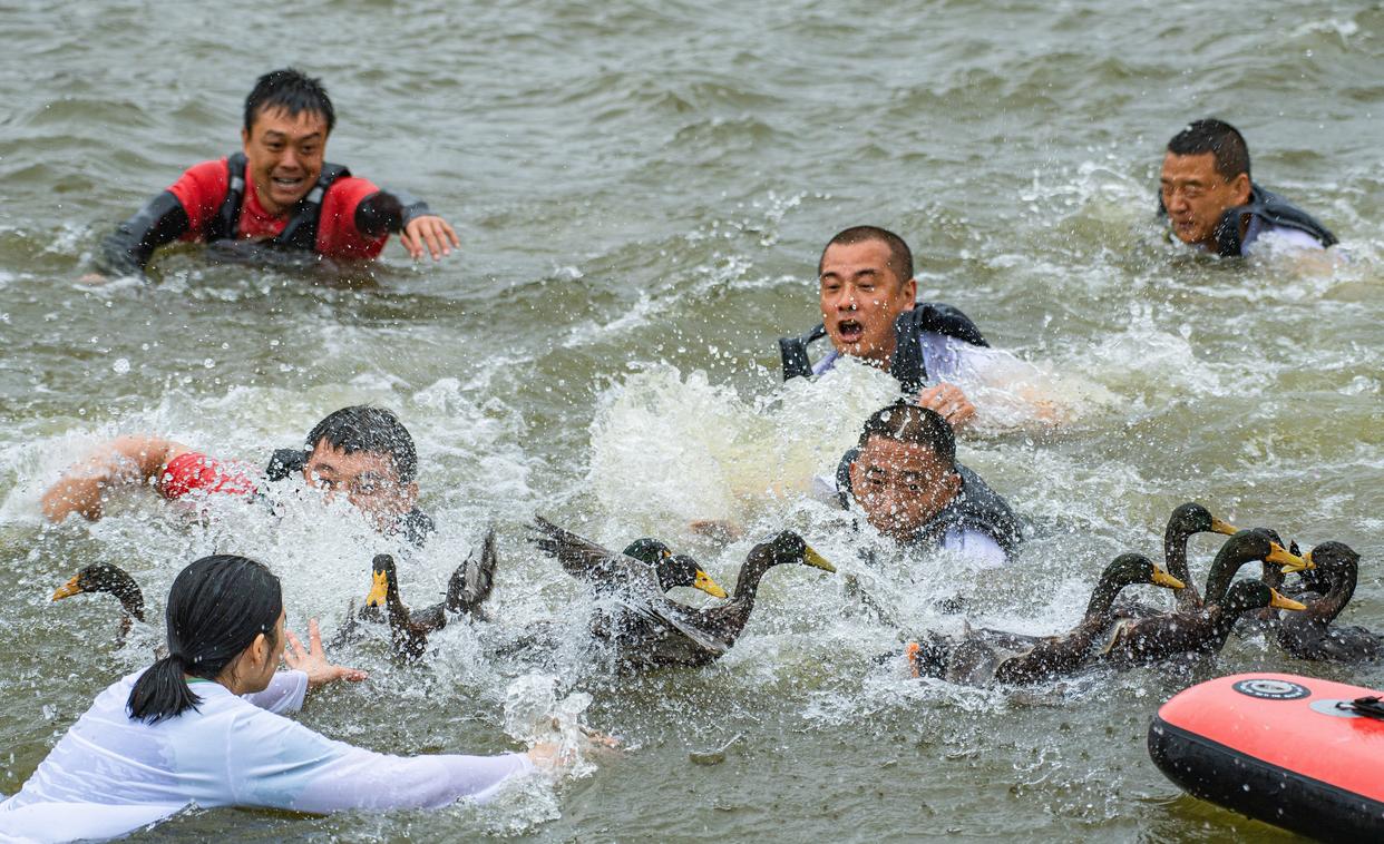 2025年5月31日,四川省樂山市五通橋區(qū)龍舟健兒參與“搶鴨子”。當(dāng)日是端午節(jié),各地群眾以多種方式歡度假期。新華社發(fā)(孔勝攝)