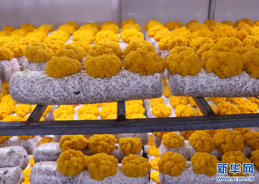在昆明市嵩明縣,云南菌視界生物科技有限公司的現(xiàn)代化菇房里,一排排菌包有序陳列,“黃金花”般的金耳在人工營造的適宜環(huán)境中生長。