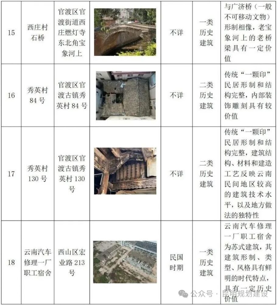 6月5日,昆明市自然資源和規(guī)劃局公示了《昆明市第七批歷史建筑推薦名單》,共涉及18處建筑,分布于五華區(qū)、官渡區(qū)、西山區(qū),建筑形態(tài)包括“一顆印”民居、石橋、廠房等。