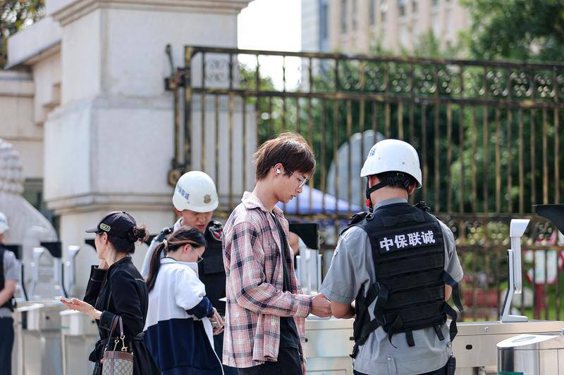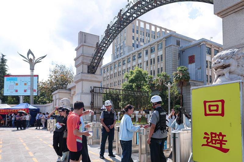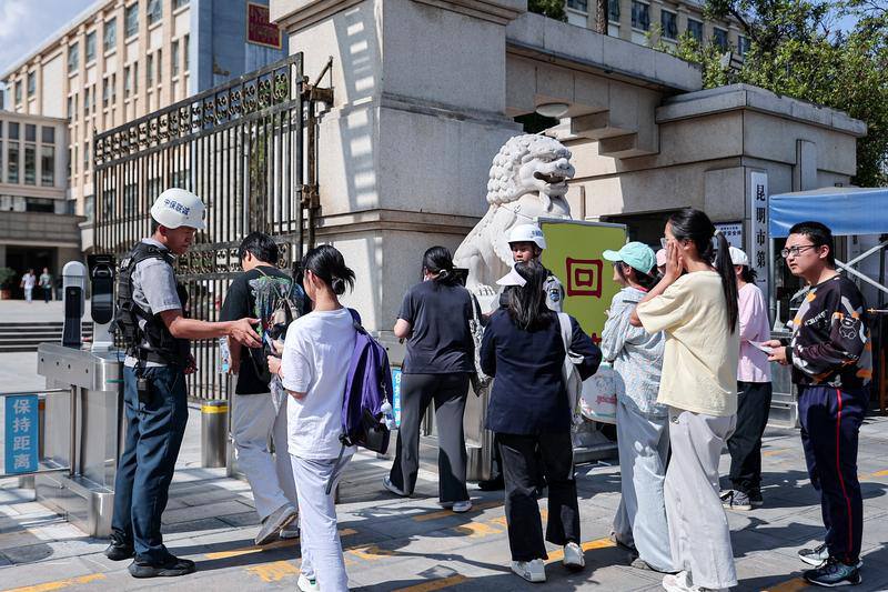 高考考生們進(jìn)入昆明市第一中學(xué)考點(diǎn),前往考場(chǎng)“踩點(diǎn)”。
