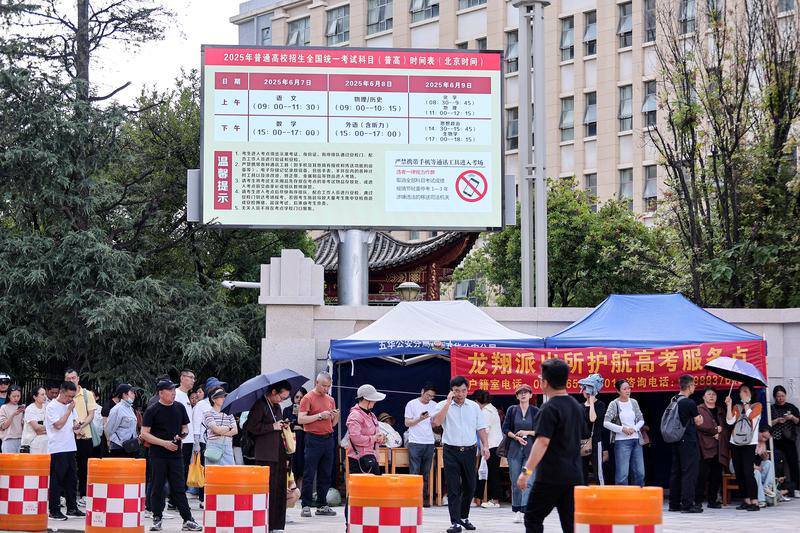 昆明市第一中學(xué)考點(diǎn)外,電子大屏滾動(dòng)播放考場(chǎng)分布示意圖及高考相關(guān)注意事項(xiàng)。