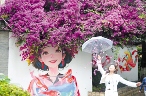 翠湖畔中和巷28號的“錦鯉女孩”壁畫火上熱搜,簪花少女花墻成了游客拍照打卡的絕佳地點?;▔σ匝貕υ苑N的三角梅為背景,描繪了一組俏皮可愛的美少女頭像,一簇簇紫紅色的花瀑傾瀉而下,與畫中捧著錦鯉的少女相遇,形成“畫中花、花中畫”的虛實交融效果。
