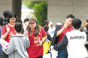 考點(diǎn)外,老師為考生加油鼓勁。記者趙偉攝