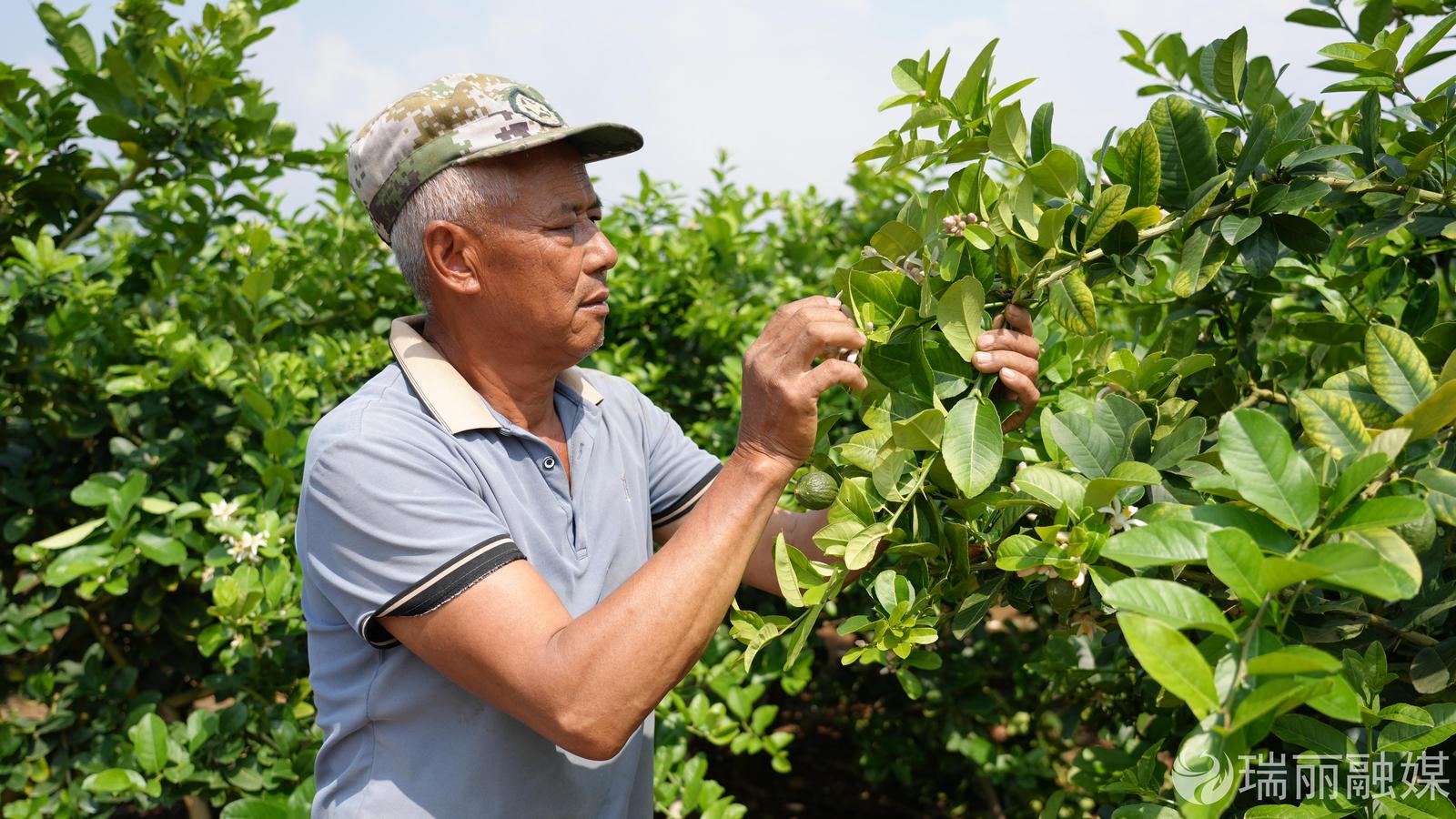 沿著水泥路驅(qū)車前行,到達另一個香水檸檬基地時,遇見了正在修枝的革康周。這位有著7年管養(yǎng)經(jīng)驗的“老管家”手法嫻熟,他和妻子一共管理著9800多棵果樹?!肮窘⒘藝栏竦闹脖9芾碇贫?,包括定期打藥、打頂修剪、施肥、除草、采果等,確保檸檬樹的健康生長。”他粗糙的手掌撫過樹梢,“年紀大了也不想去太遠的地方打工,在這里跟著熱經(jīng)所的專家學習果樹管理,每年穩(wěn)穩(wěn)當當能掙到10來萬元。”