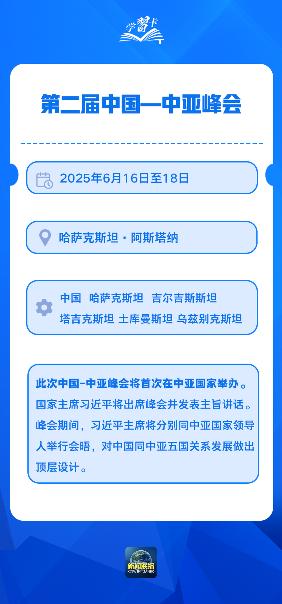 應(yīng)哈薩克斯坦共和國總統(tǒng)托卡耶夫邀請(qǐng),國家主席習(xí)近平將于6月16日至18日赴哈薩克斯坦阿斯塔納出席第二屆中國—中亞峰會(huì)。