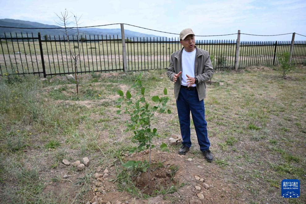 6月3日,在哈薩克斯坦伊塞克國(guó)家歷史文化博物館附近,丁巖介紹中哈聯(lián)合考古隊(duì)一起種下的山楂樹(shù)。新華社記者 李任滋 攝
