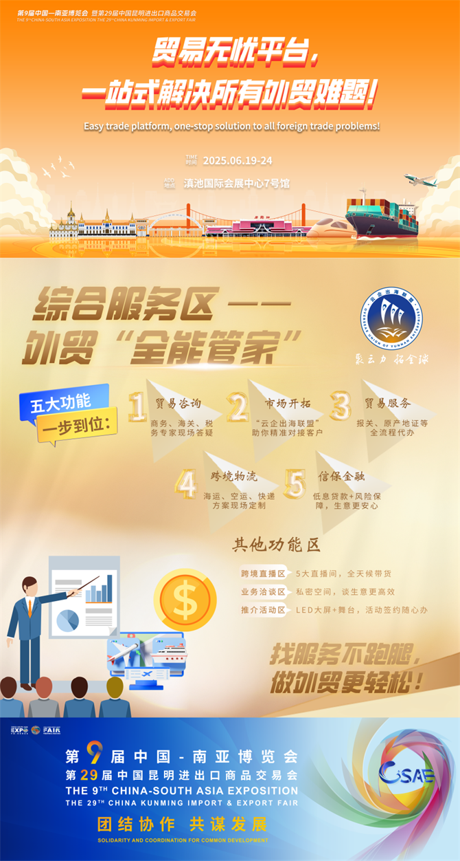 6月19日至24日,第9屆中國—南亞博覽會暨第29屆中國昆明進出口商品交易會將在昆明滇池國際會展中心啟幕。7號館貿(mào)易無憂平臺全面升級、亮點紛呈。