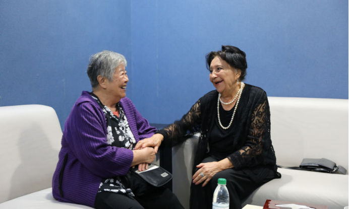 2024年10月9日,“人民音樂家”冼星海之女冼妮娜(左)和哈薩克斯坦音樂家拜卡達莫夫之女拜卡達莫娃闊別5年后在武漢約見。新華社發(fā)(劉天一攝)