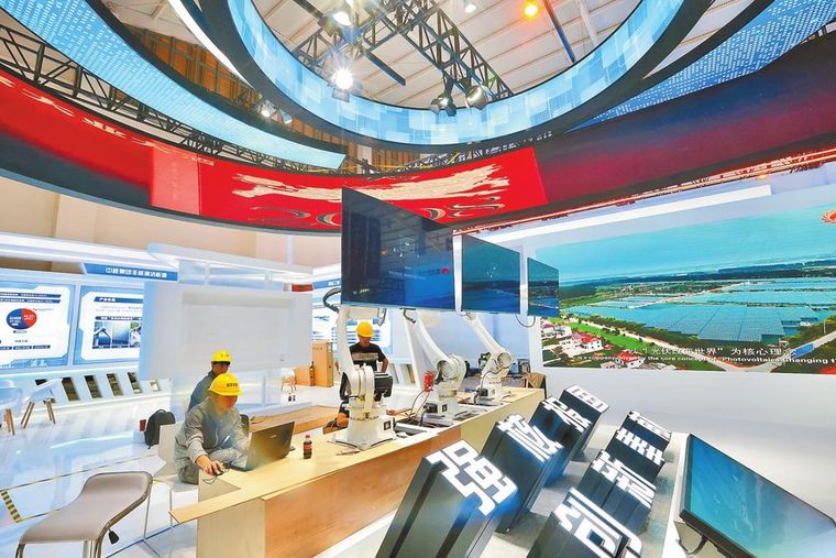 在中核集團(tuán)展區(qū),施工人員正緊張有序布展。 ?本報記者 高吳雙 攝