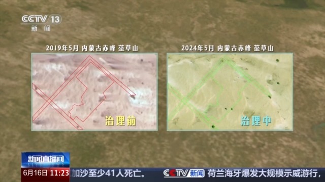 去年5月,當?shù)貑忧s(cuò)草山沙地綜合治理。我們通過衛(wèi)星遙感影像,甚至能清晰地看到當時壯觀的治理場景,密密麻麻的草方格,將原本大片的黃色沙地覆蓋。那么,這里的治理效果如何呢?