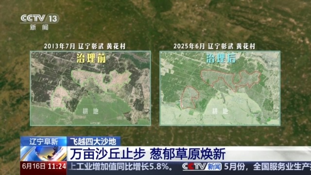 對比衛(wèi)星遙感影像,我們發(fā)現(xiàn),曾經(jīng)因風沙侵襲形成的、像波浪一樣的連片沙丘地貌,如今已經(jīng)被密集的植被覆蓋。