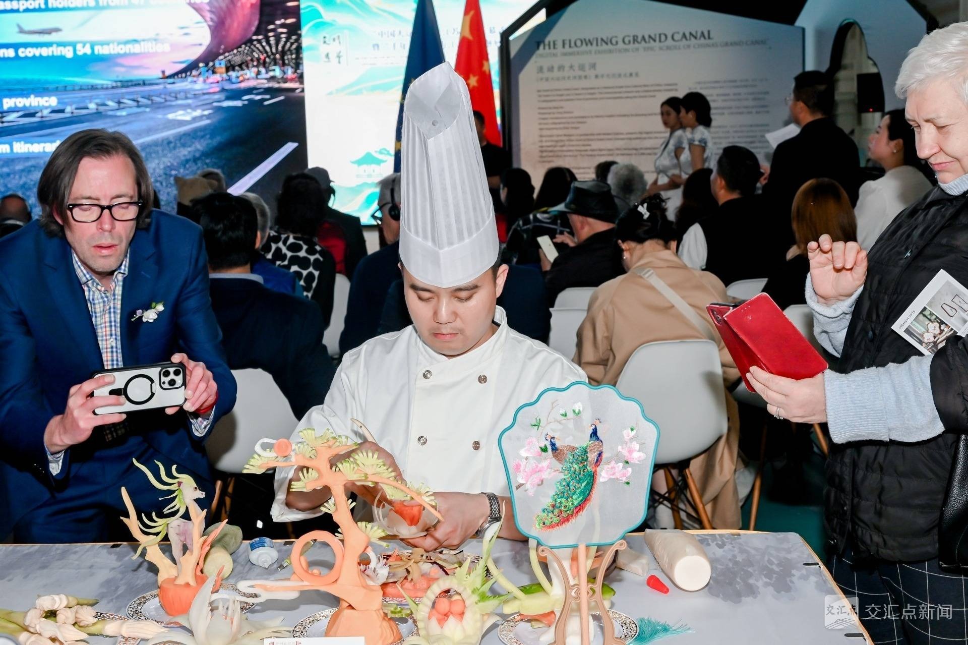 美食體驗區(qū)則氤氳著江南煙火氣。常州蘿卜干、銀絲面、封缸酒、東坡獅子頭、麻糕等常州美食一字?jǐn)[開。美食雕刻、非遺面塑與吹糖技藝、宋式茶點搭配蒙眼切豆腐的絕技,展現(xiàn)傳統(tǒng)工藝的匠心。獅子頭、蘿卜干炒飯等淮揚滋味,引得中外賓客贊不絕口。知名演員宋佳的丈夫史蒂芬是比利時人,受妻子影響也是“中國迷”,他們逛展覽、品美食,被獅子頭“圈粉”。史蒂芬激動地說,“我想馬上去中國!”