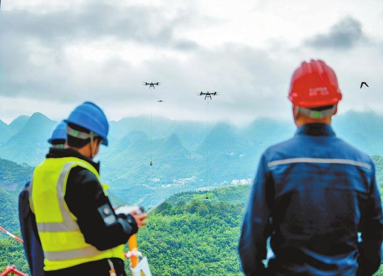 針對(duì)傳統(tǒng)電網(wǎng)建設(shè)運(yùn)輸方式需砍伐林木修建臨時(shí)通道,且會(huì)破壞當(dāng)?shù)貛r溶地貌的實(shí)際,云南電網(wǎng)探索出高山喀斯特地帶無(wú)人機(jī)集群運(yùn)輸標(biāo)準(zhǔn)化方案,采用載重200公斤、300公斤級(jí)的共計(jì)16架重載無(wú)人機(jī)集群編隊(duì),對(duì)西疇集中式光伏接網(wǎng)工程全線52基鐵塔的塔基材料實(shí)施空中運(yùn)輸。