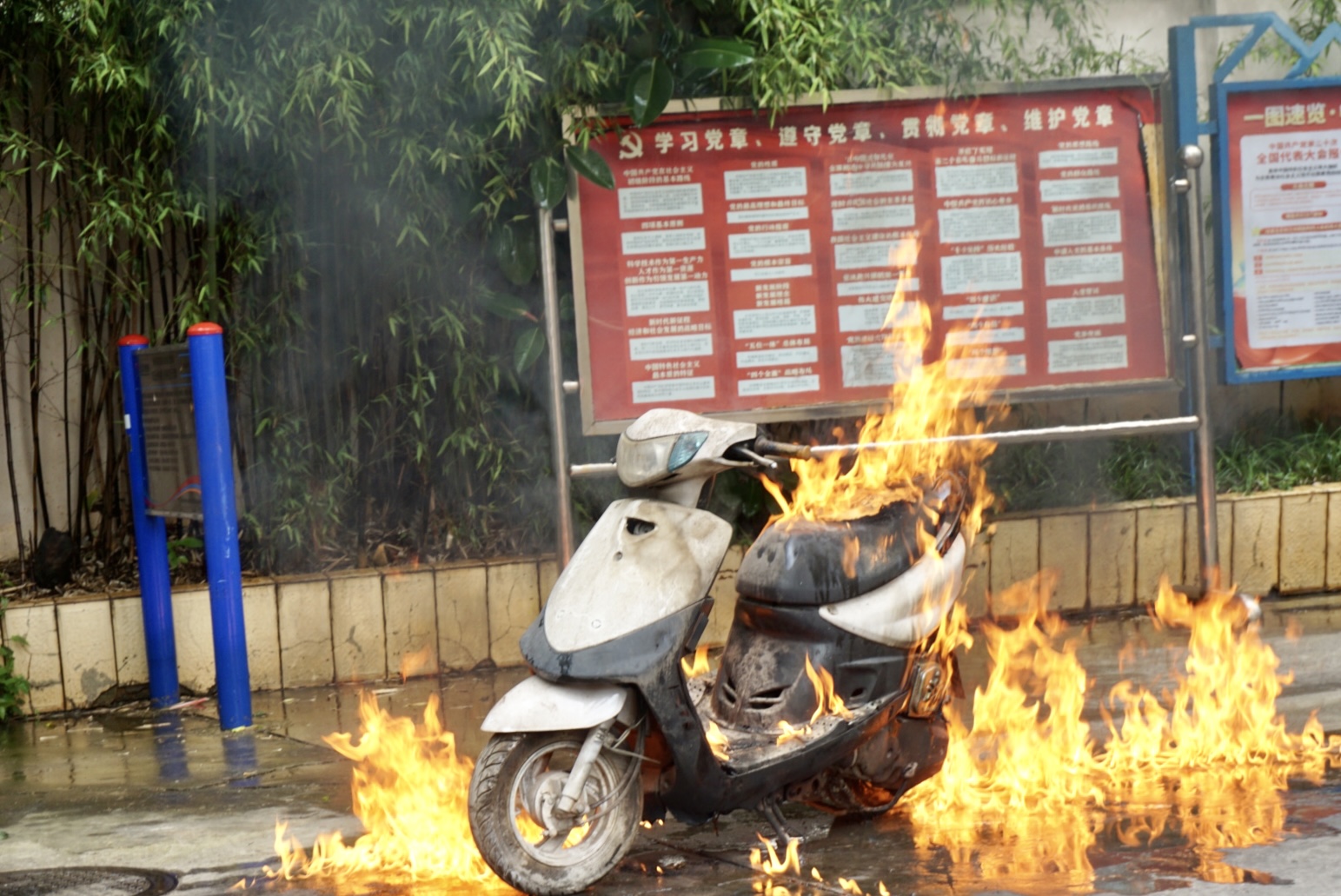 電動(dòng)自行車燃燒過(guò)程中產(chǎn)生大量刺鼻濃煙。