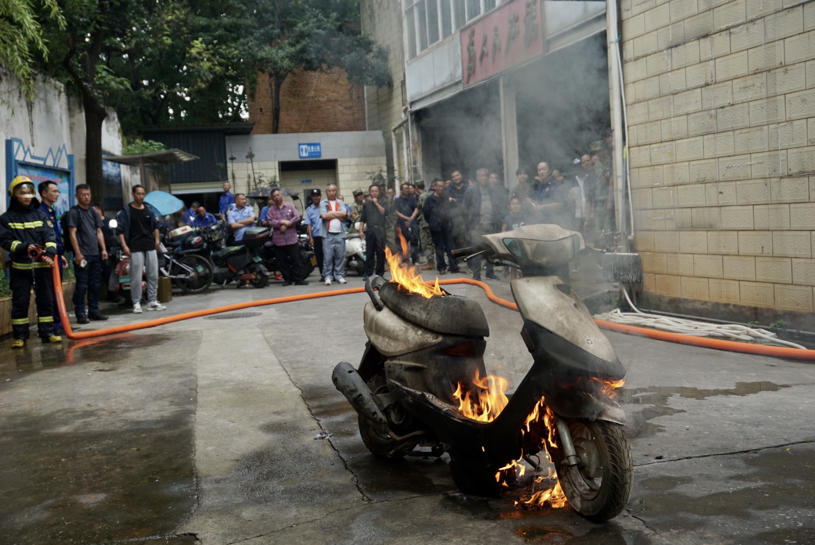現(xiàn)場(chǎng)進(jìn)行電動(dòng)自行車燃燒實(shí)驗(yàn)。