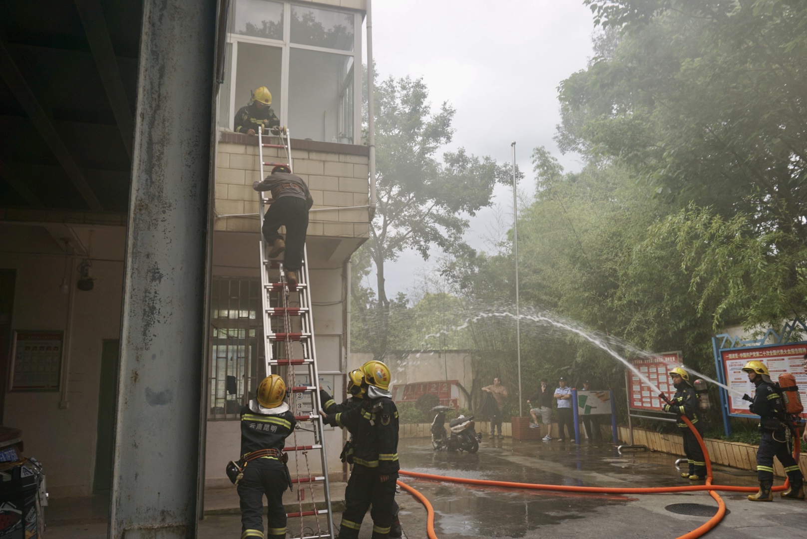 為了讓參訓(xùn)人員更深刻地感受到火災(zāi)發(fā)生過(guò)程中煙氣帶來(lái)的危害,以及火場(chǎng)被困救援過(guò)程,理論培訓(xùn)結(jié)束后,還進(jìn)行了電動(dòng)自行車燃燒實(shí)驗(yàn)和火場(chǎng)逃生演練。當(dāng)電動(dòng)自行車燃燒以后,濃烈刺鼻的煙味讓現(xiàn)場(chǎng)人員紛紛捂住口鼻。逃生演練環(huán)節(jié),模擬和平社區(qū)辦公樓1樓著火,2樓有人員被困。消防員接警后迅速到達(dá)現(xiàn)場(chǎng)展開(kāi)救援,隨后,外圍壓制控火、沿樓層鋪設(shè)水帶內(nèi)攻、爬梯疏散救援等科目逐一展開(kāi),讓在場(chǎng)人員充分了解了消防救援的全過(guò)程,體驗(yàn)了“火場(chǎng)”等待救援的緊張時(shí)刻,讓抽象的消防知識(shí)變得可感可觸、可學(xué)可用。
