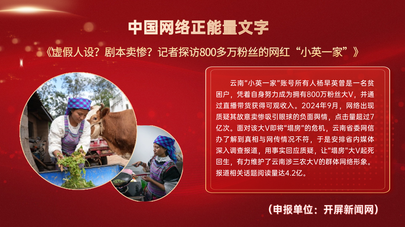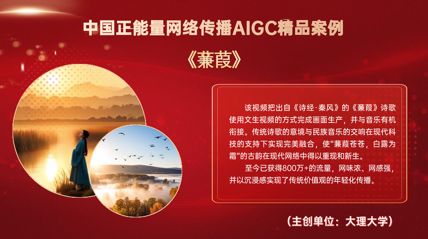 中國正能量網絡精品征集展播活動被譽為互聯網內容建設的“奧斯卡”,云南在此項活動中表現亮眼——自2021年率先開展省級征集活動以來,云南作品已連續(xù)4年入選全國展播,數量穩(wěn)居全國前列。2024年,云南更實現新突破,AI生成作品《蒹葭》成功入選全國“正能量網絡傳播AI精品案例”,成為前沿技術與正能量傳播融合的典范。