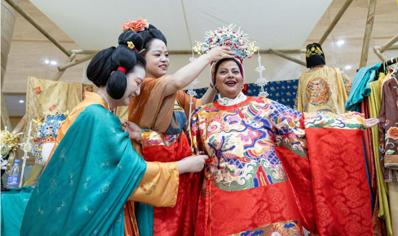A participant (R) of the Shanghai Cooperation Organization (SCO) Media and Think Tank Summit tries traditional Chinese attire at the venue of the summit in Zhengzhou, central China's Henan Province, July 25, 2025. (Xinhua/Bai Xueqi)