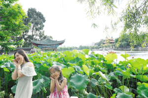 母女在大觀公園拍“荷”趣照。