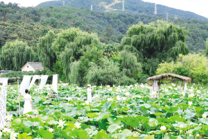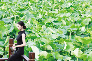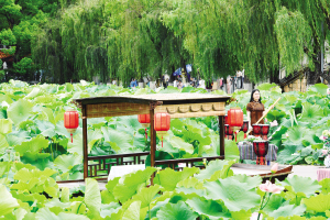 游客以荷為背景在大觀公園拍國風照。
