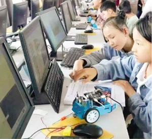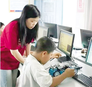 孩子們在志愿者指導(dǎo)下編寫程序操控小汽車。