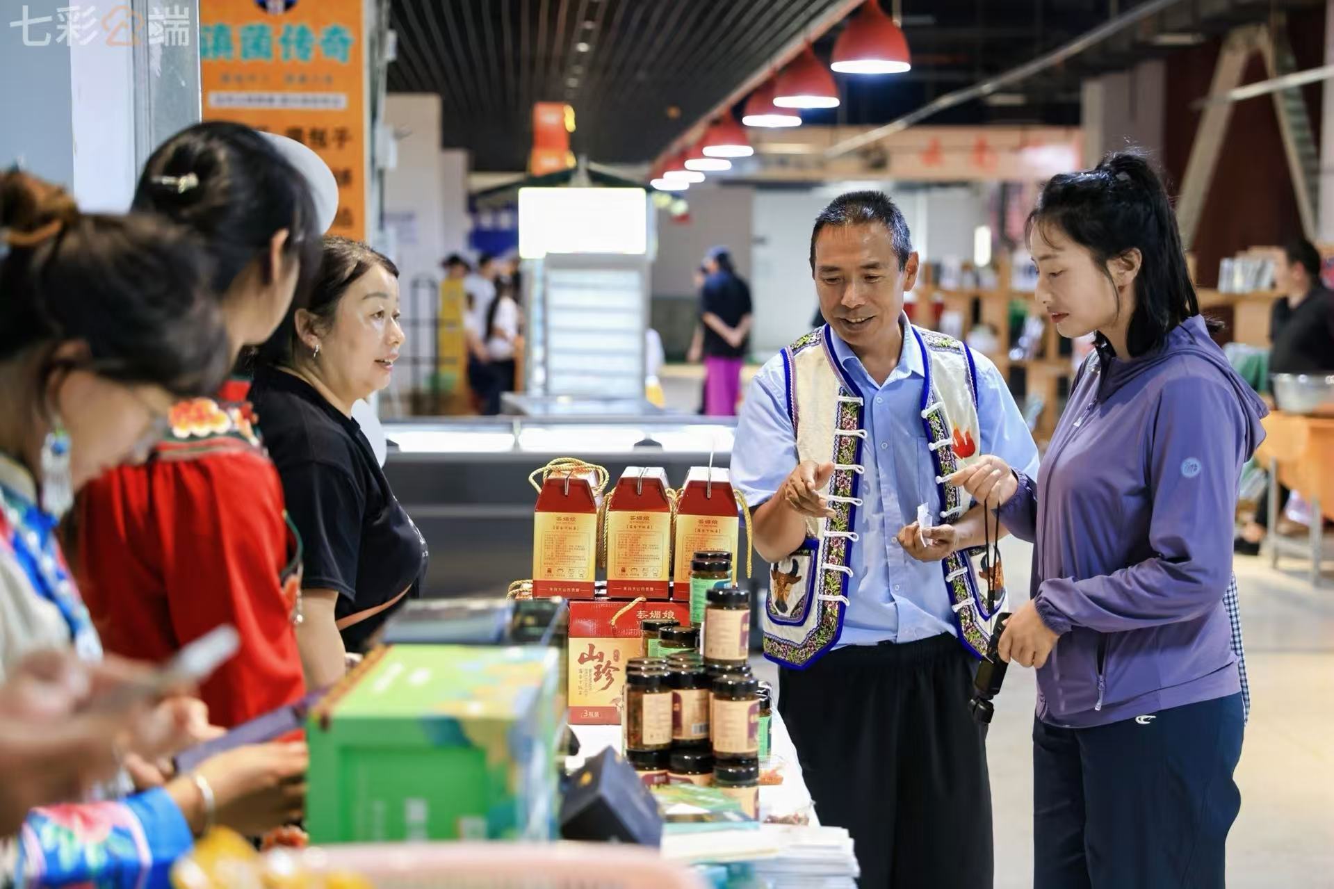 在野生菌主題集市,鮮菌展示區(qū)松茸、牛肝菌、雞樅琳瑯滿目,引得游客駐足詢價(jià)。專業(yè)講解員現(xiàn)場(chǎng)演示烹飪流程。凍品區(qū)客戶將野生菌烤串遞到游客手中,展示與銷售同步火熱。文創(chuàng)區(qū)彝繡菌菇圖案包袋、菌形玩偶等特色產(chǎn)品,讓非遺技藝與山珍文化碰撞出火花。每日特色活動(dòng)亮點(diǎn)紛呈:8月3日攝影展定格菌山之美,音樂(lè)會(huì)奏響民族韻律;8月4日名廚現(xiàn)場(chǎng)演繹松茸刺身絕技,親子課堂里孩子辨識(shí)菌種;8月5日左腳舞教學(xué)讓游客與彝族文化共舞。