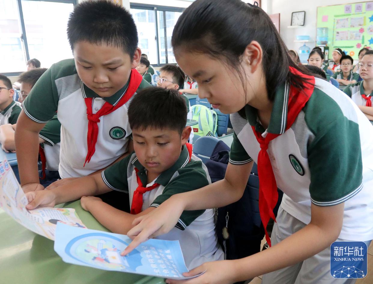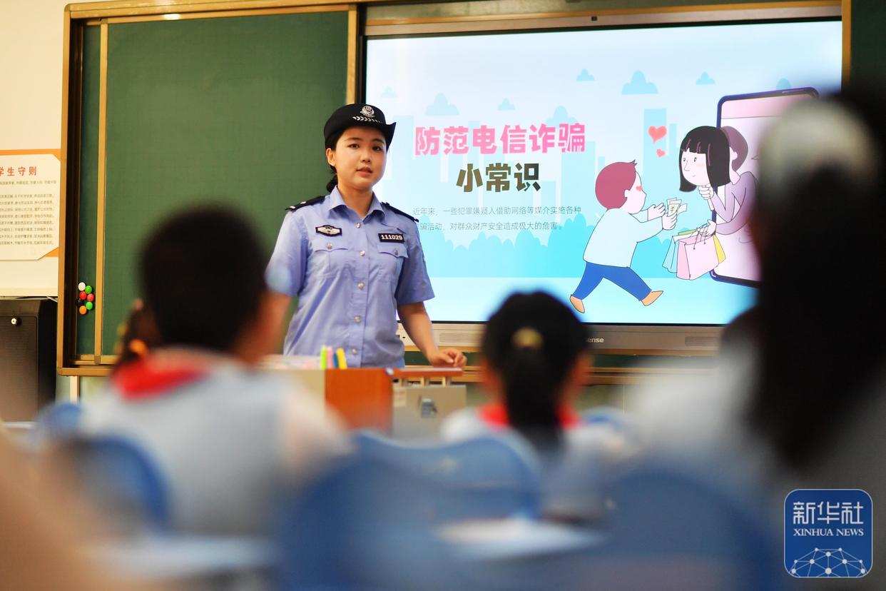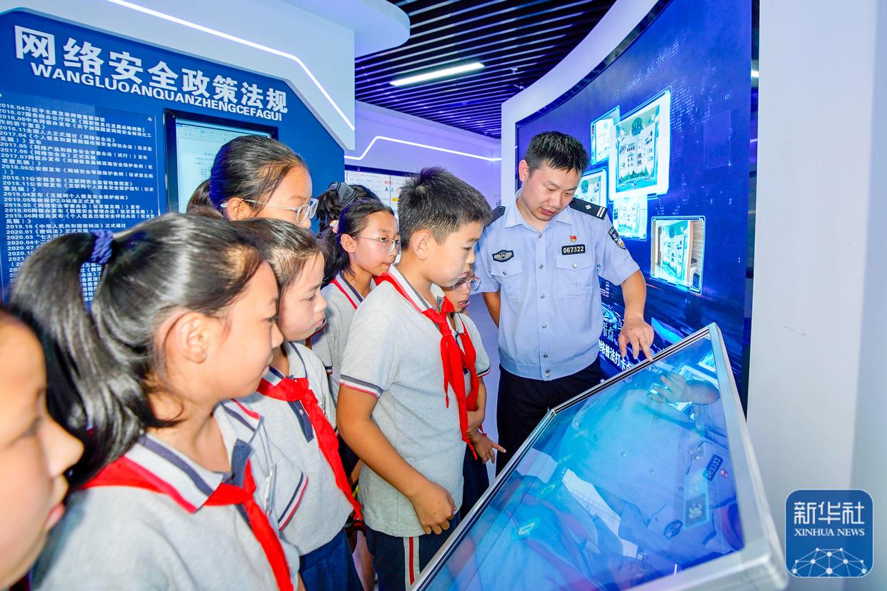 9月15日,在江蘇省泰興市襟江小學(xué)教育集團(tuán)佳源校區(qū),泰興市公安局城北派出所民警通過互動方式在給學(xué)生講解網(wǎng)絡(luò)安全知識。新華社發(fā)(顧繼紅攝)