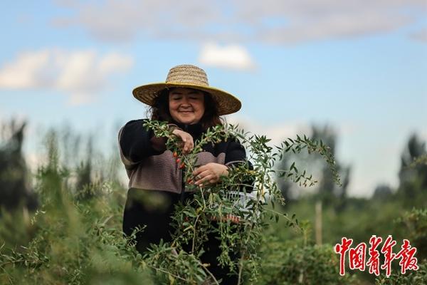 9月11日,新疆博爾塔拉蒙古自治州精河縣吾夏克巴依西村,地麗努爾在采摘枸杞。她來自鄰村永集湖村,每年夏秋兩季來這里摘枸杞。吾夏克巴依西村是精河縣枸杞核心種植區(qū),自20世紀(jì)70年代開始種植枸杞,全村現(xiàn)有枸杞種植面積4600畝。通過產(chǎn)業(yè)鏈延伸和技術(shù)升級,該村枸杞產(chǎn)業(yè)產(chǎn)值大幅提升,帶動村民人均收入增加近1000元,采摘季為周邊提供大量季節(jié)性就業(yè)崗位。中青報·中青網(wǎng)記者 曲俊燕/攝