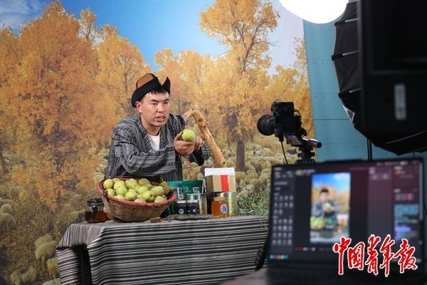 9月9日,新疆巴音郭楞蒙古自治州尉犁縣直播基地,24歲的喀比力·喀地爾正在直播帶貨,銷售香梨、羅布麻原葉等當(dāng)?shù)靥禺a(chǎn)。該基地2024年實現(xiàn)銷售額1.7億元,成為全疆名優(yōu)特產(chǎn)品線上集中展示的窗口。其中,年輕人扛起了疆貨出疆的大旗,尉犁縣電子商務(wù)協(xié)會牽頭的直播隊伍中,主播的平均年齡約26歲。中青報·中青網(wǎng)記者 王鑫昕/攝